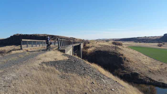 It is listed on my Delorme map as the Fish Lake Trail. But this is the unfinished sections way south of Cheney and I also see it listed as the Columbia Plateau Trail. But the cool thing is that is goes 10 miles down to Benge and heading north it goes all the way to Cheney. I wonder if one could just ride into Benge and then up the old Railway Fish Lake Trail back to the John Wayne? Hmmmmm. Rock may be very rough though and just not worth it yet, but an option for a longer southern Cow Creek detour”. It’s also a good spot to head north to Spokane if you are taking the train back to Seattle. However, read ahead. You do NOT want to miss the trail from here to Tekoa.From there we continued on riding some more on the elevated railway part.