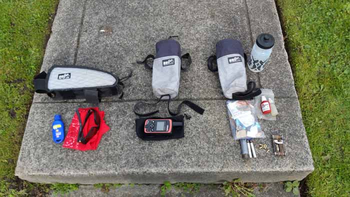 - Crank Brothers High/Low volume Pump, patch kit courtesy of NWBIC, 2 tire levers, zip ties, duct tape wrapped around a lighter, extra chain links, master link, Hayes disc brake pad reset tool and a small bottle of lube.