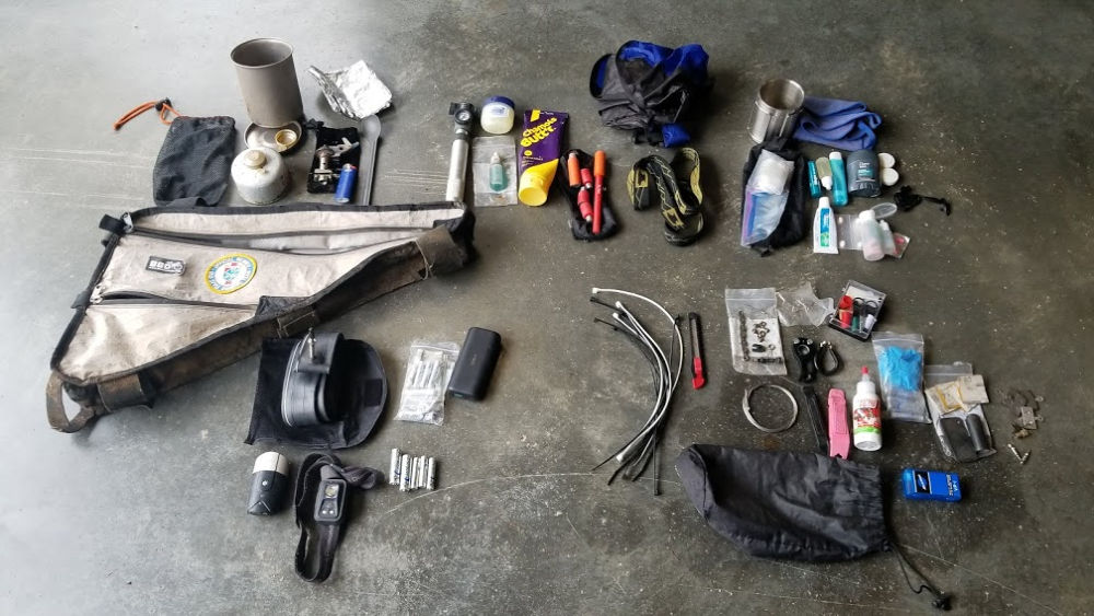 - Personal skin care: One nearly full bottle of Chamois butter to prevent chaffing. It’s heavy so I wanted it low in the frame bag. I also grabbed a bottle of Vaseline from the Eldon re-supply due to concern about my already chaffed skin and the upcoming predicted rain. Wet clothing that is full of salt feels like sand paper on your skin. So that stuff was heavy to carry but chaffing is terrible.